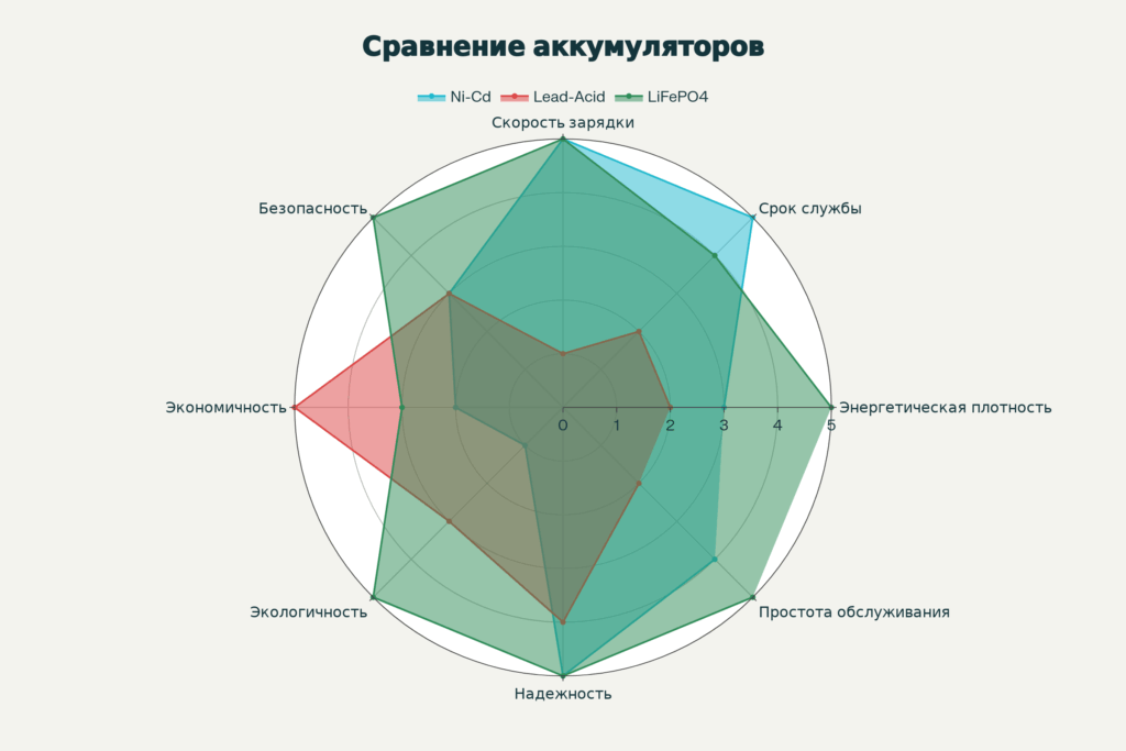 LiFePO4 технология представляет наилучший баланс характеристик для большинства современных применений, предлагая высокую энергетическую плотность, долговечность, безопасность и экологичность. Ni-Cd аккумуляторы остаются незаменимыми для критически важных применений в экстремальных условиях, несмотря на экологические ограничения. Свинцово-кислотные аккумуляторы продолжают быть экономически привлекательным решением для применений, где их недостатки не критичны.